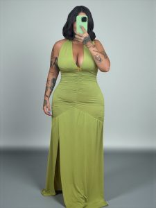 Vestido ajustado con frunces que ayudan a realzar nuestra figura. Cuello halter y ajustable.